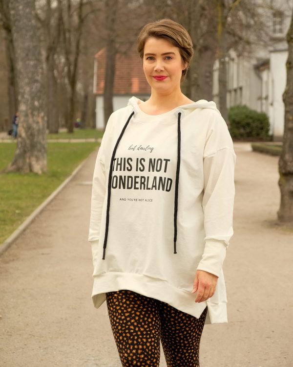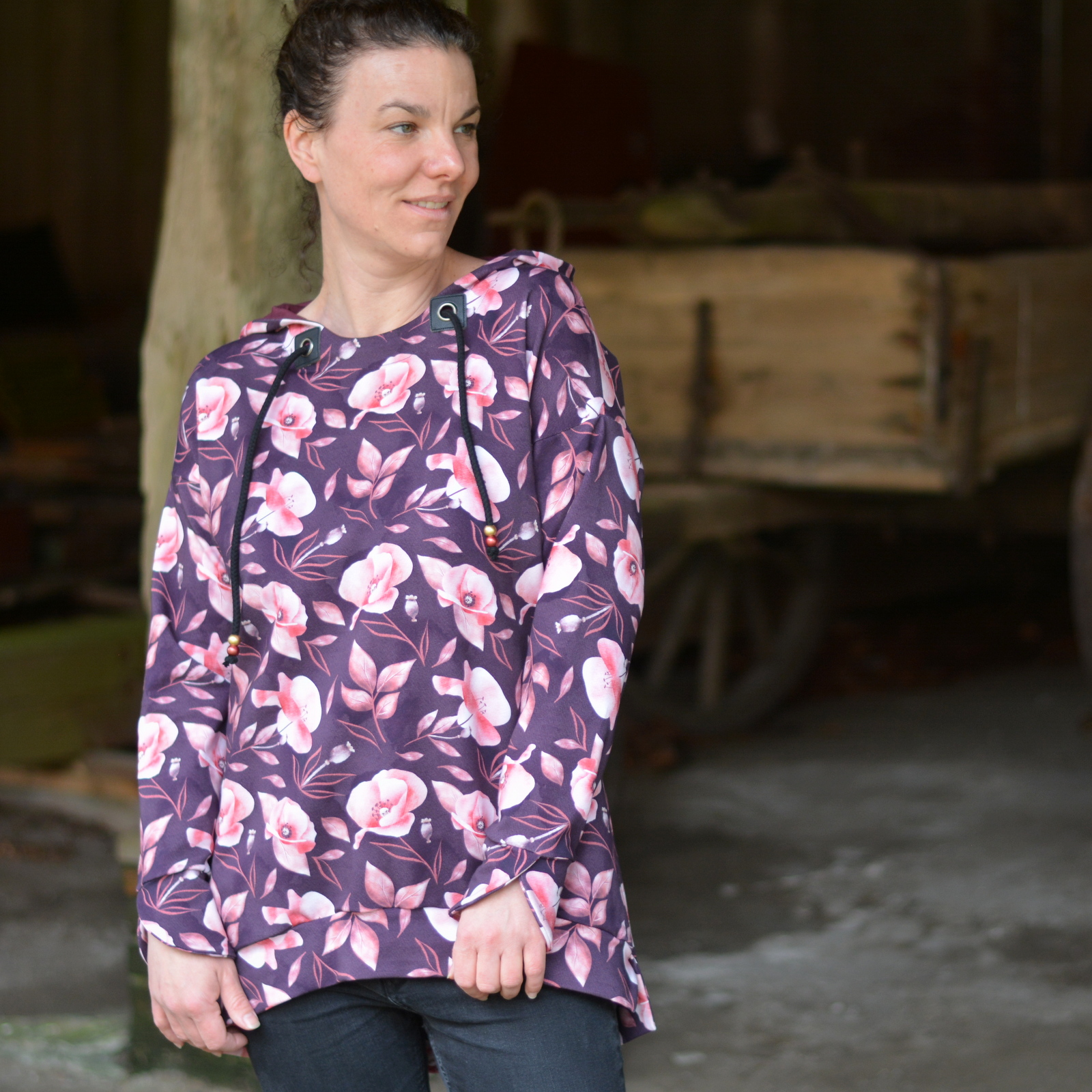 Pippa´s Mom kommt leicht abgewandelt, mit einer vom Vorderteil direkt übergehenden Kapuze daher. Der weitere Halsausschnitt macht Pippa´s Mom so noch etwas femininer und super lässig. Geblieben ist, dass auch Pippa´s Mom vorne etwas kürzer als hinten gehalten ist (Vokuhila) und das geteilte Saumbündchen hat.